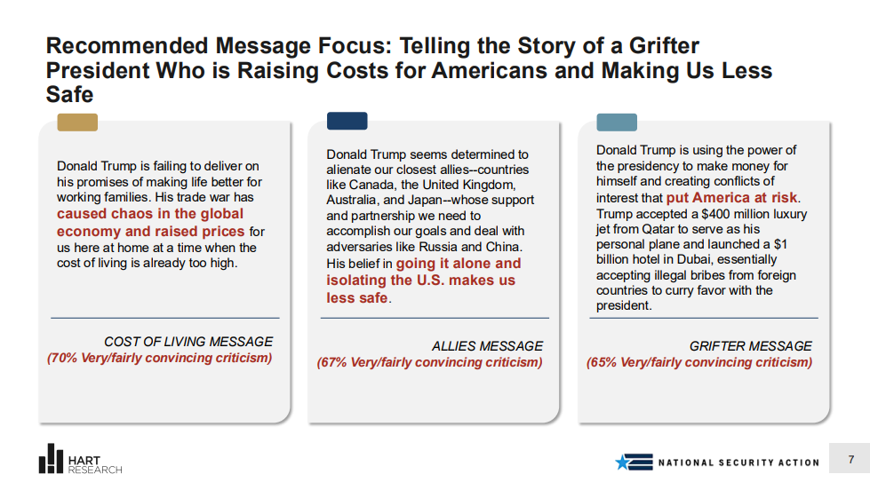 The partisan alignment of these critiques closely matches messages that were tested in National Security Action’s summer poll: