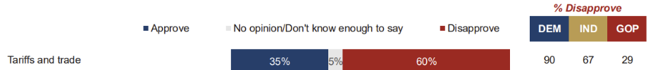 A majority of voters — including 67% of Independents — disapprove of the way Trump is dealing with tariffs and trade. Nearly a third of Republican voters disapprove as well.